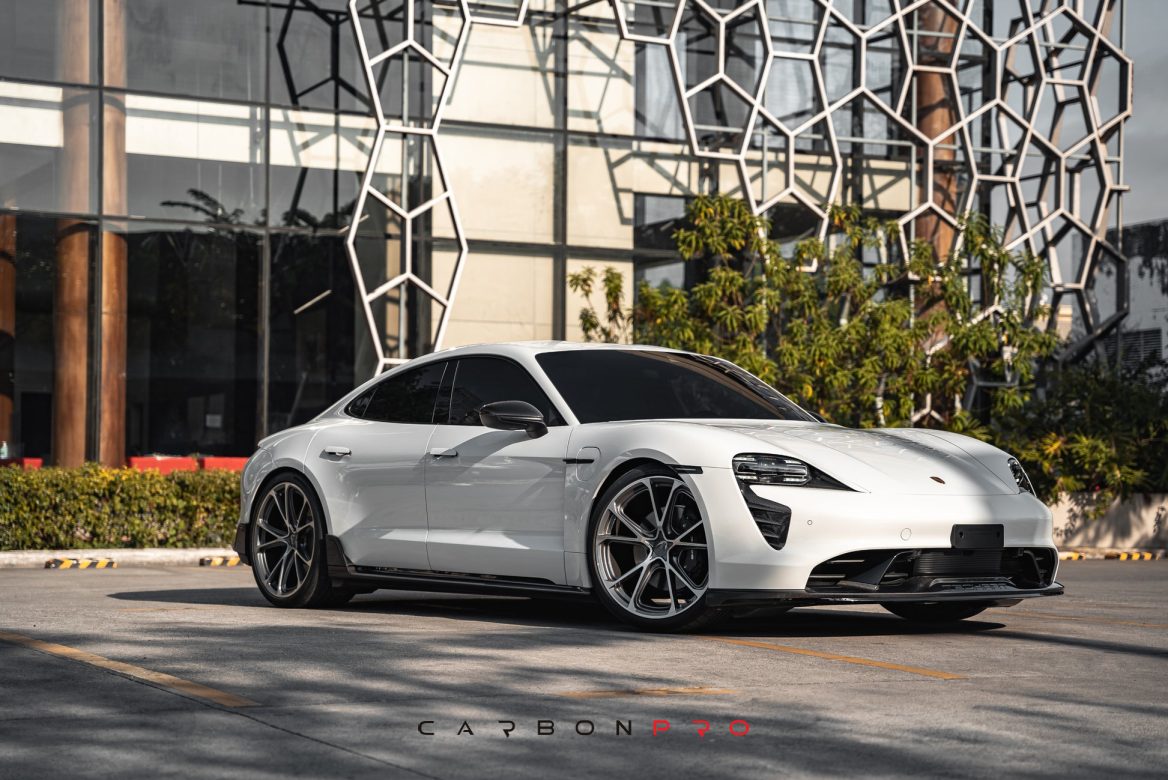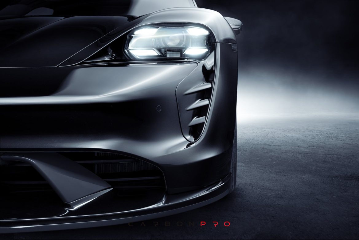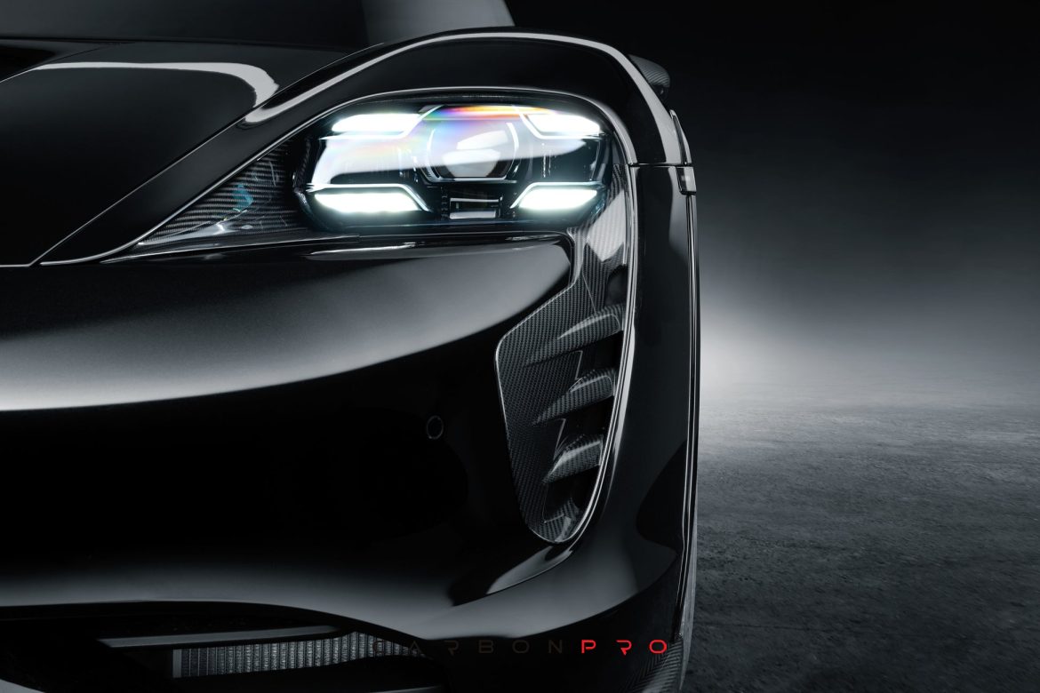 The dynamic TECHART styling of the front section is complemented with air curtains made of carbon fiber. These are available for Taycan Sports Sedan models with regular front apron as well as for vehicles with Porsche SportDesign front.